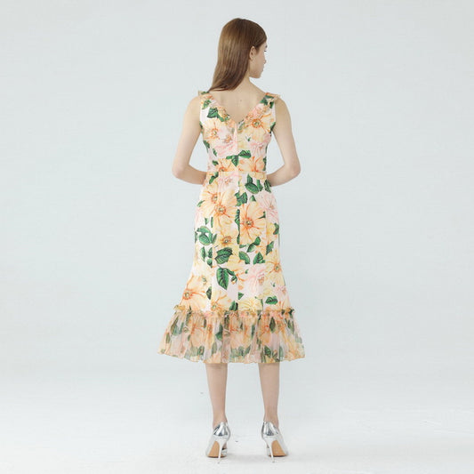 Ruffle V-neck Camellia Printed Fishtail Dress