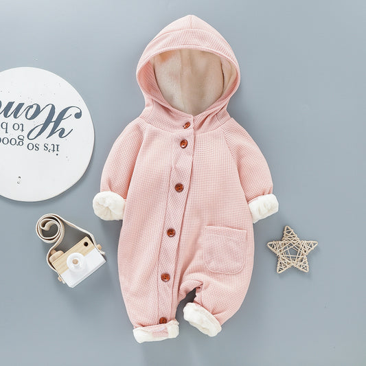 Einfarbiger Krabbelanzug für Babys mit Kapuze und langen Ärmeln und Knöpfen