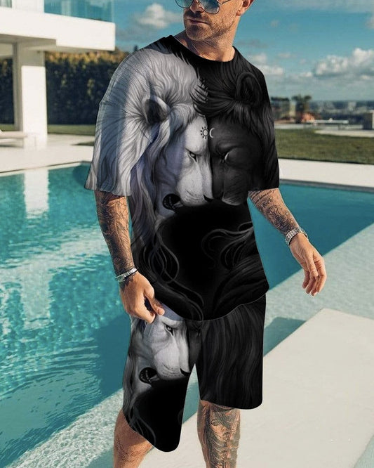 Summer Gradient Digital Printing Loose Short-sleeved T-shirt Two-piece Summer Plus Size Shorts Suit Men