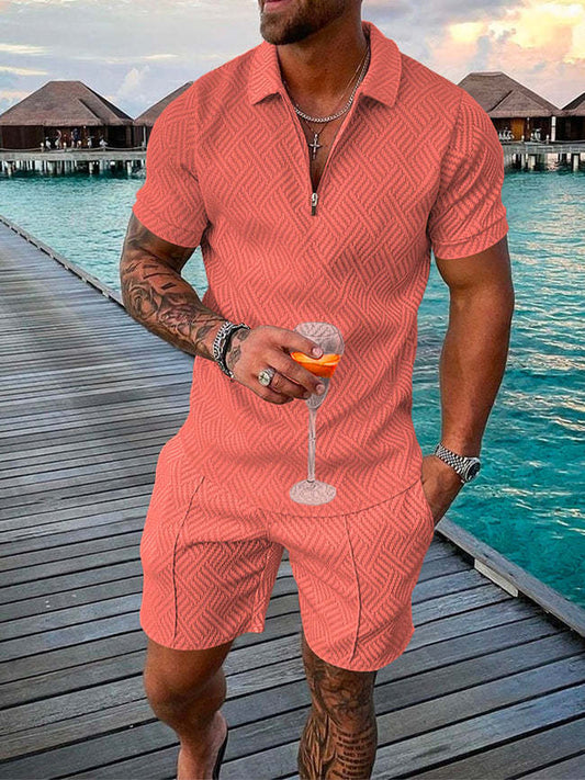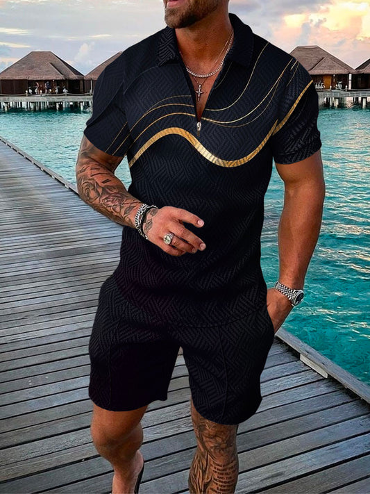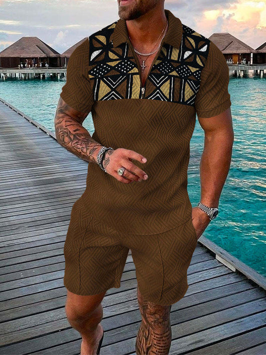 Men's Summer Fashion 3D Printed Short Sleeve Geometric Zip Lapel Shirt Set