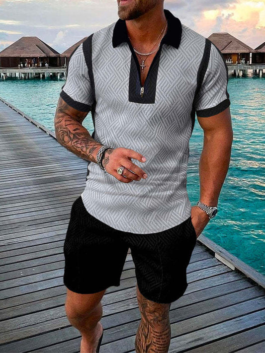 Men's Summer Fashion 3D Printed Short Sleeve Geometric Zip Lapel Shirt Set