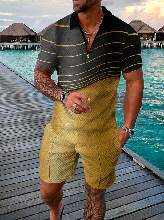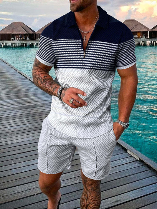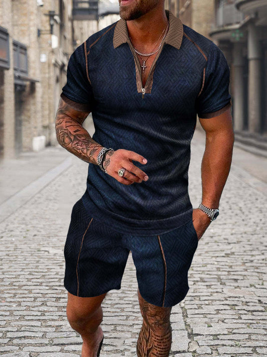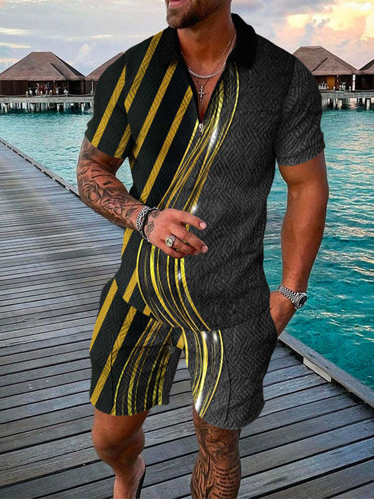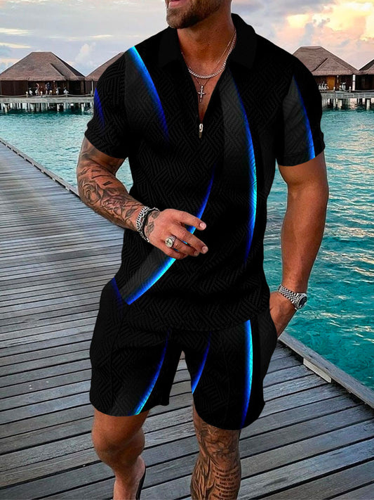 Men's Summer Fashion 3D Printed Short Sleeve Geometric Zip Lapel Shirt Set